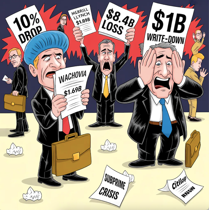 4 ноября — Citigroup. Главный удар месяца. Дополнительные списания на $8–11 млрд. CEO Чарльз Принс ушёл. Акции Citi потеряли 45% с начала года — $124 млрд капитализации испарились.