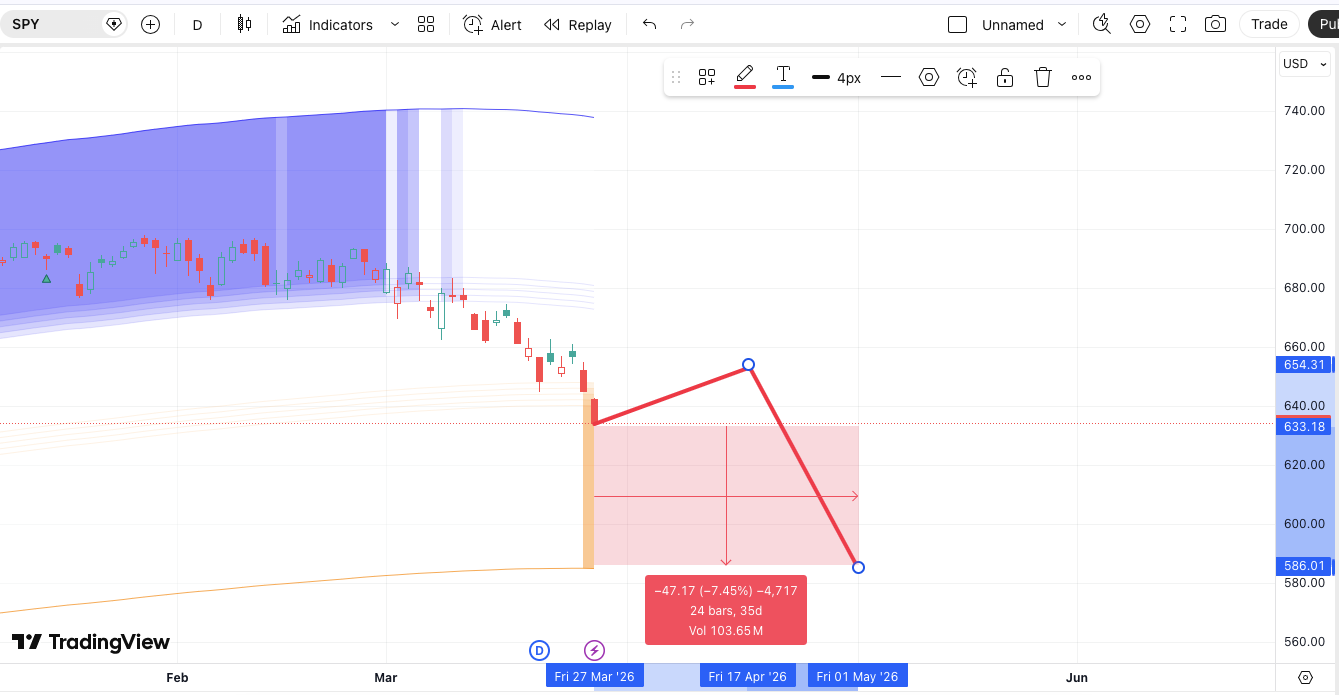 Если к этому моменту прогресса в переговорах не будет достигнуто — а многие политологи сейчас говорят, что «ни одна из сторон уже неспособна выйти с высоко поднятой головой» — есть вероятность, что к 1 мая мы увидим ключевой технический уровень: $588 по $SPY.